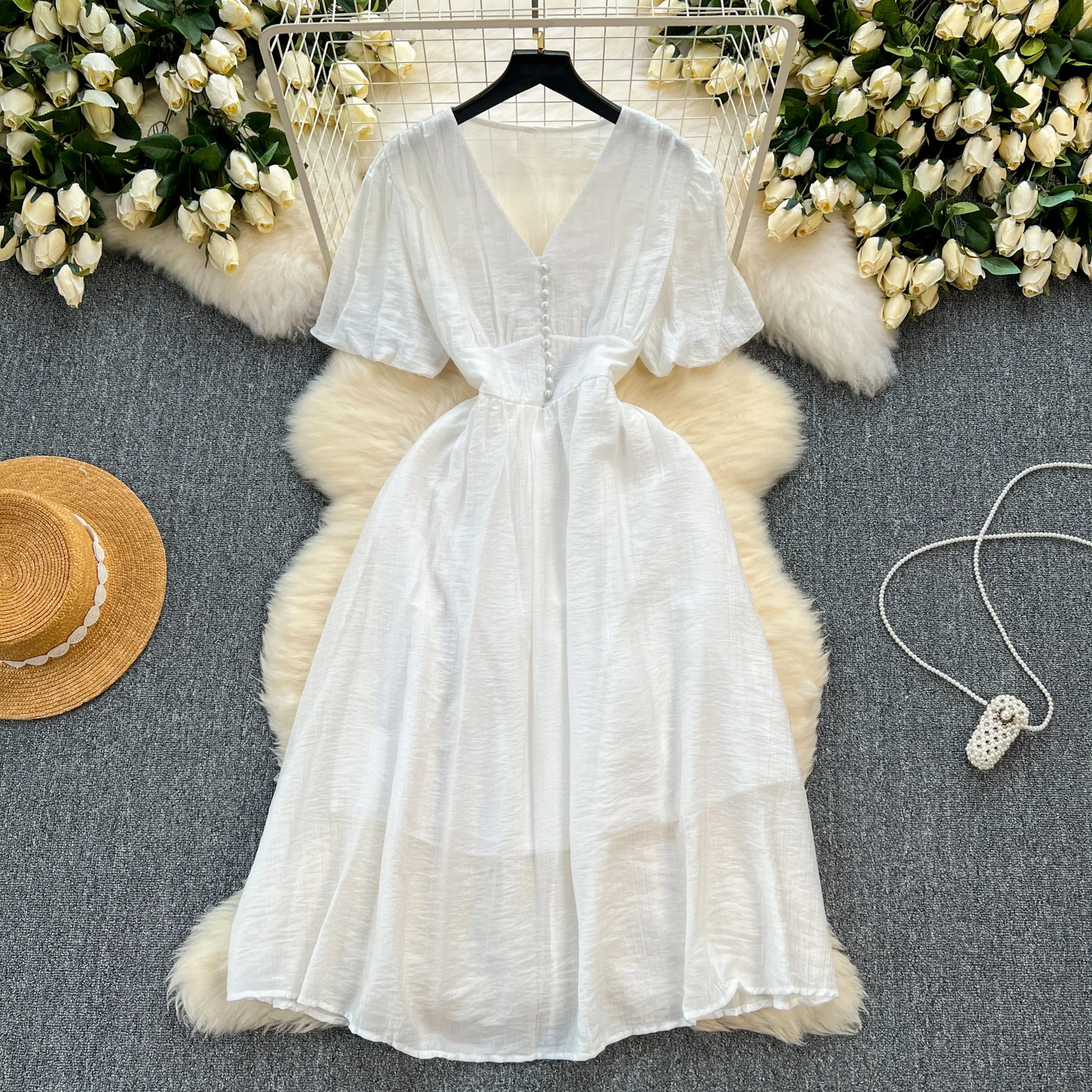Customized Summer Dress Women's Solid Color V-Neck Short Sleeve Dress